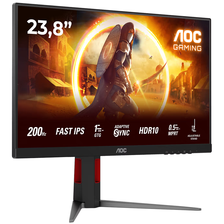 AOC Monitor Gaming 24G4HA, 24″ (23.8″ viewable), Fast IPS, FHD (1920×1080), 200Hz, 0.5ms MPRT (1ms GtG), 300 cd/m2, 1000:1, Adaptive Sync, G-Sync Compatible, HDR10, 2x HDMI 2.0, 1x DP 1.4, Speakers, Full Ergo