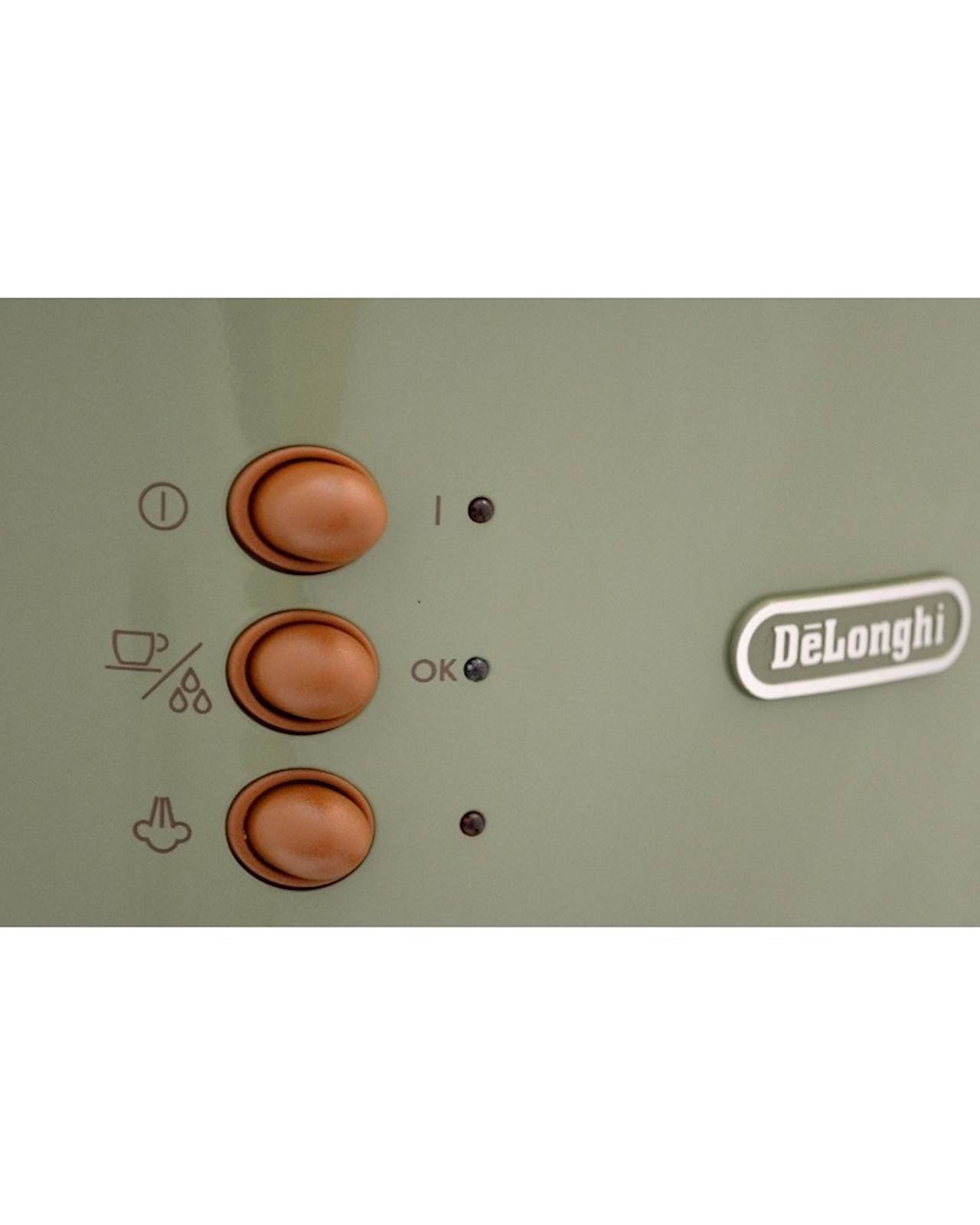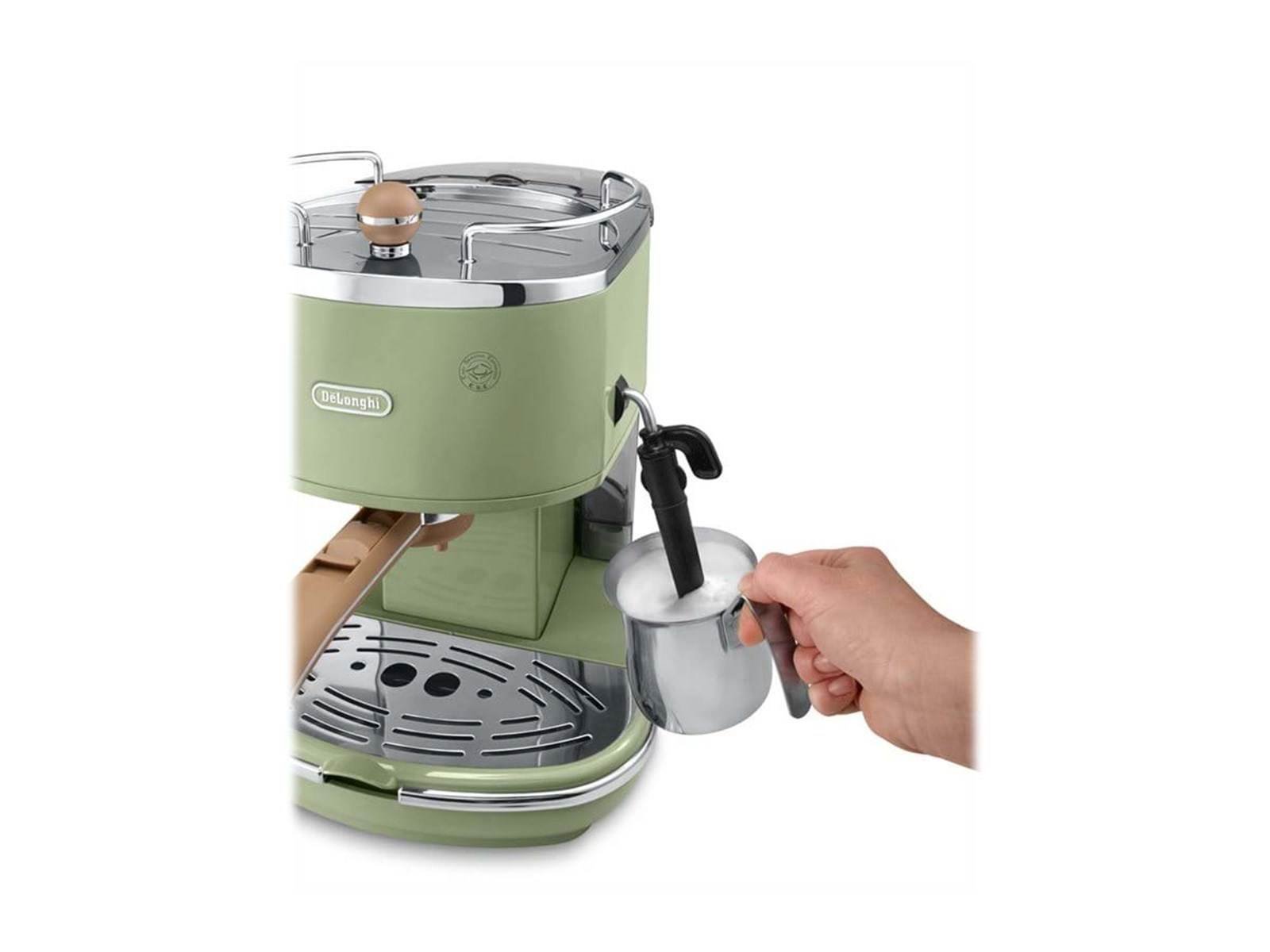 Elegantni aparat za espresso kavu vintage talijanske vještine izrade SAŽETAK Odaberite omiljenu mješavinu kave ili kapsulu i skuhajte bogati, glatki espresso sa savršenom pjenom Pripremite širok raspon mlijecnih napitaka zahvaljujuci rucnom Cappuccino sistemu Unesite dašak eskluzivne elegancije u svoju kuhinju uz elegantan dizajn Icona Vintage u maslinasto zelenoj boji GLAVNE KARAKTERISTIKE Dizajn Icona Vintage Istinski klasik italijanskog dizajna, Icona Vintage ima sofisticiranu završnu obradu visokog sjaja s elegantnim, retro kromiranim detaljima. pritisak od 15 bara Znacajka pritiska od 15 bara omogucuje pripremu ukusnog espressa bogate arome i primamljive kremaste pjene boje oraha. Rucni Sustav za cappuccino Uz klasicnu pjenjacu za mlijeko možete rucno miješati paru i mlijeko kako biste postigli savršenu gustocu pjene za omiljene mlijecne napitke. Mljevena kafa ili kapsule Odaberite mljevenu kafu ili kapsule jednostavne za korištenje kako biste skuhali kafu.