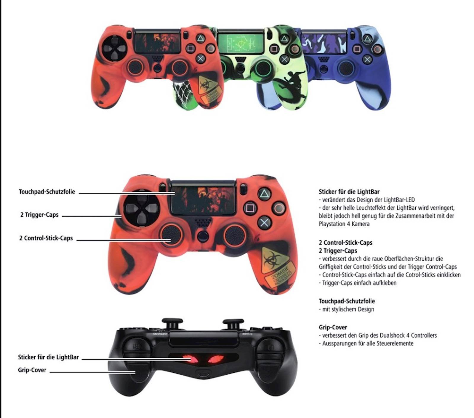Poboljšava ergonomsko rukovanje sa Dualshock 4 kontrolerom i stilski personalizira kontroler, bez odvrtanja Poklopac rukohvata: Poboljšava prianjanje Dualshock 4 kontrolera Izrezi za sve kontrolne elemente Kompatibilan sa Hama “Multistand” (stavka br. 00115455), “Mini” (stavka br. 00115468) i “Black Thunder” (stavka br. 00115469) stanicama za punjenje Kompatibilan sa “Black Thunder” (artikl br. 00115467) produženom baterijom 2 poklopca kontrolne palice i 2 kapice okidaca: Gruba površinska struktura poboljšava prianjanje kontrolne palice i okidaca Jednostavno kliknite poklopce kontrolne palice na kontrolne palice Jednostavno zalijepite poklopce okidaca Touchpad zaštitna folija: Sa modernim dizajnom Naljepnica za LightBar Mijenja dizajn LightBar LED-a Vrlo jaki svjetlosni efekti LightBar-a su smanjeni, ali ostaju dovoljno lagani za interakciju sa Playstation 4 kamerom
