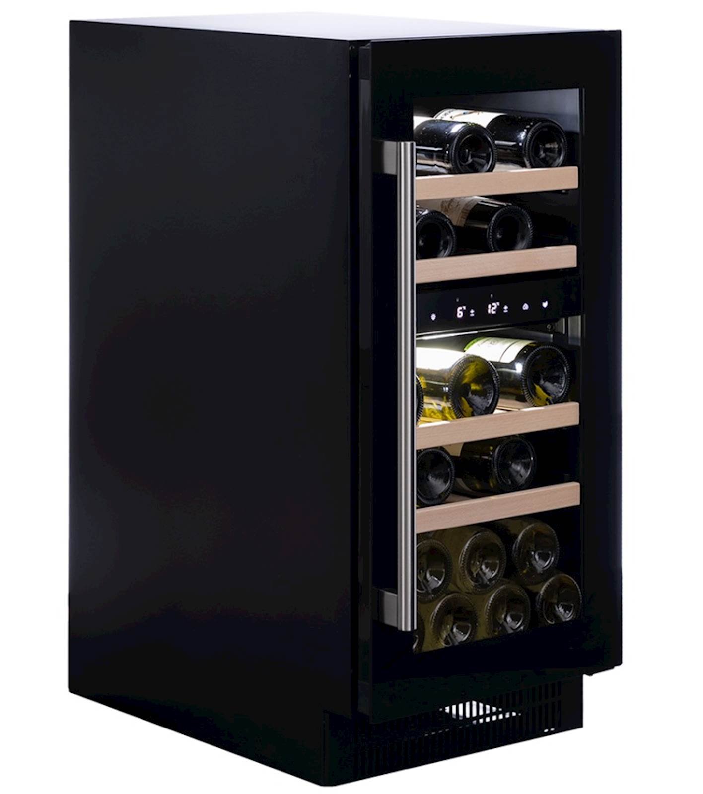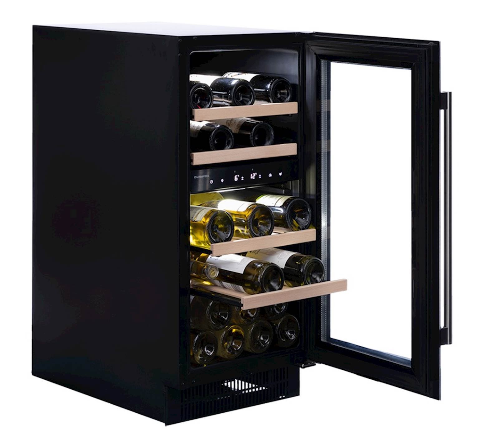 Dvostruka temperaturna zona, model za 32 boce ispod pulta, elegantnog vanjskog izgleda i rucke od nehrdajuceg celika. DUNAVOX Flow-32D savršen je za savremene kuhinje. Boce su postavljene na pune drvene police i okružene bijelom, jantarnom i plavom unutarnjom LED rasvjetom. Donja zona mora biti hladnija od gornje zone. Ovaj model je namijenjen kao ugradbeni element ispod pulta.