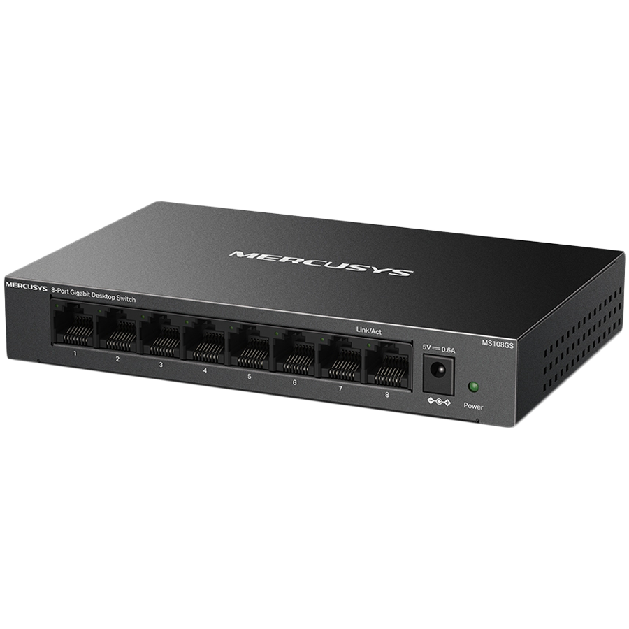 Mercusys MS108GS 8-Port Gigabit Desktop Switch, 8× Gigabit Ports, Desktop Steel Case, Wall Mounting, Plug and Play, Power Saving, Compact design, Green Ethernet technology, Silent
