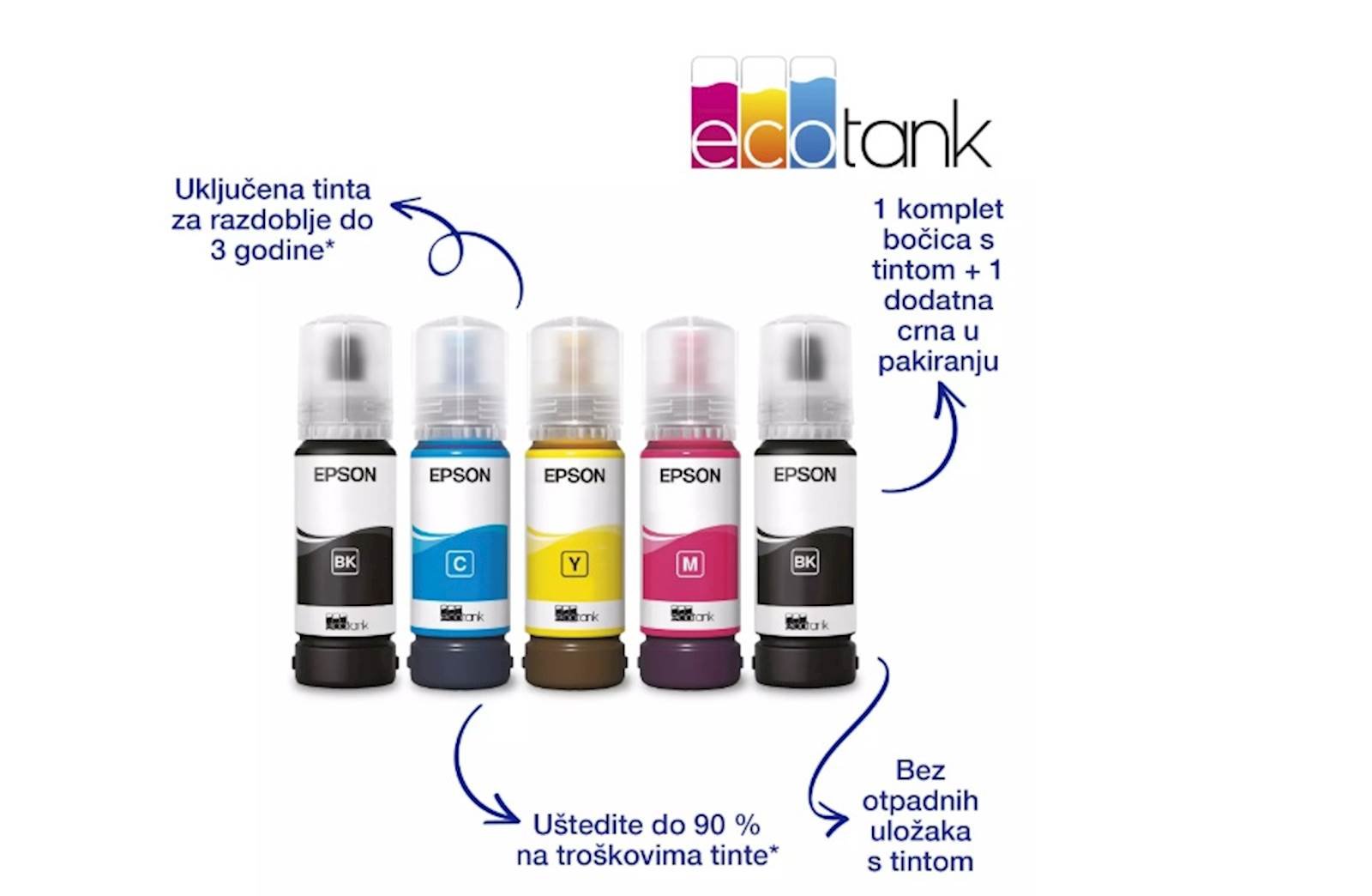 EcoTank omogucuje ispisivanje kod kuce bez briga – spremnici s tintom iznimno visokog kapaciteta omogucuju nadopunjavanje bez nereda, a poseban dizajn bocica je osmišljen tako da se mogu umetnuti samo ispravne boje. Ovaj ekonomicni printer štedi do 90% na troškovima ispisa i u pakiranju je priložena zaliha tinte u trajanju do tri godine. Ispišite do 6600 crno-bijelih stranica i 5900 stranica u boji s priloženom tintom. Uz kompaktan dizajn i potpunu spojivost putem Wi-Fi mreže i Wi-Fi Direct-a, možete jednostavno integrirati ovaj printer s postojecim kucnim uredajima i ispisivati s mobilnih uredaja, tableta i prijenosnih racunara.