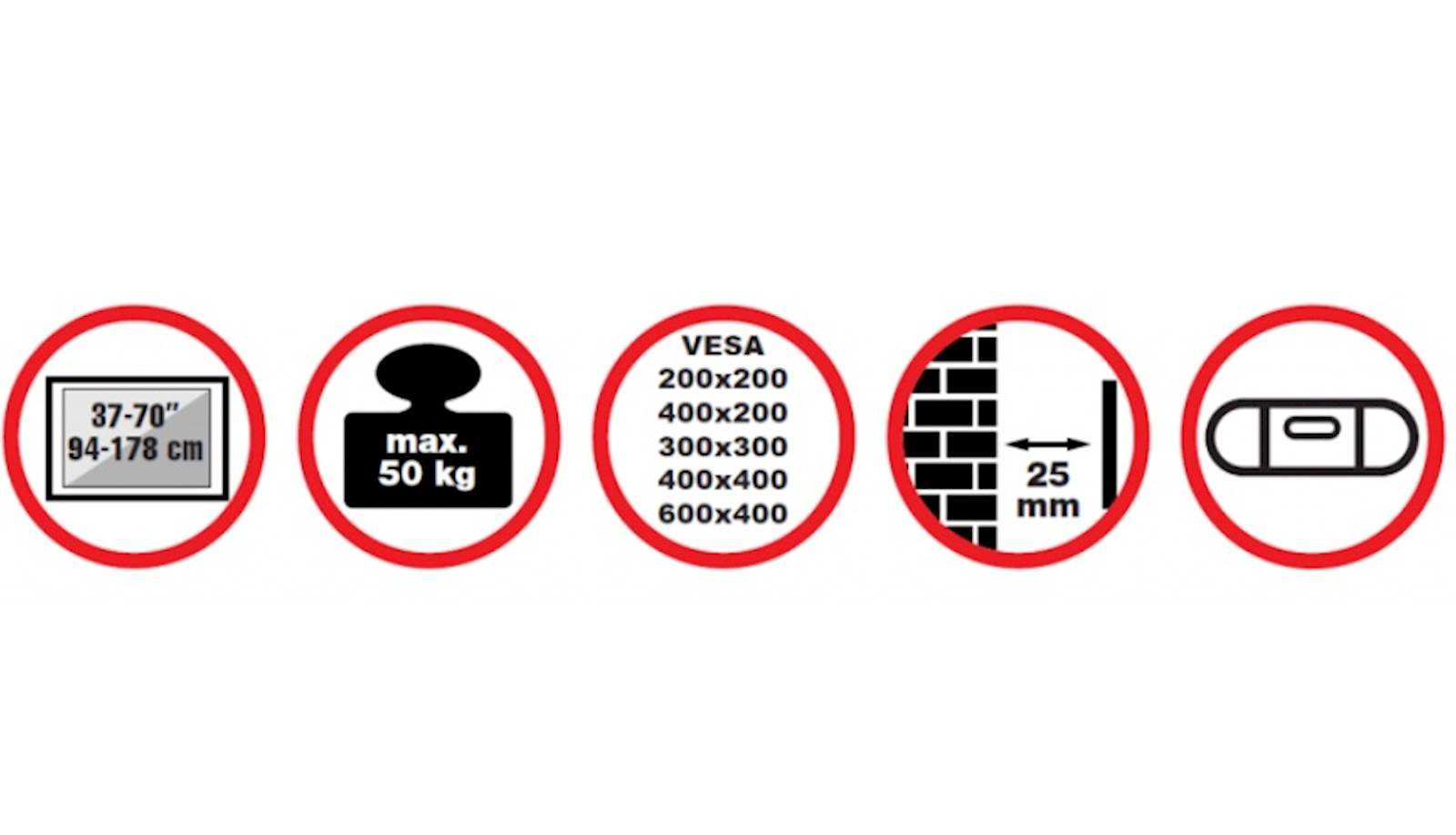 Ekonomicni fiksni zidni nosac može primiti vecinu LED i LCD televizora s ravnim zaslonom od 37″-70″ maksimalne težine od 50 kg/110 lbs. Tanak dizajn udaljen je samo 25 mm od zida kako bi nadopunio elegantan izgled ultra tankih televizora. Njegova automatska opružna brava s klikom i jednostavnim otpuštanjem sigurno pricvršcuje vaše ravne zaslone na zid. Jednostavna konstrukcija omogucuje jednostavnu ugradnju. Bocno pomicanje omogucuje pomicanje televizora lijevo i desno na zidnoj ploci tako da je postavljen tacno tamo gdje želite.