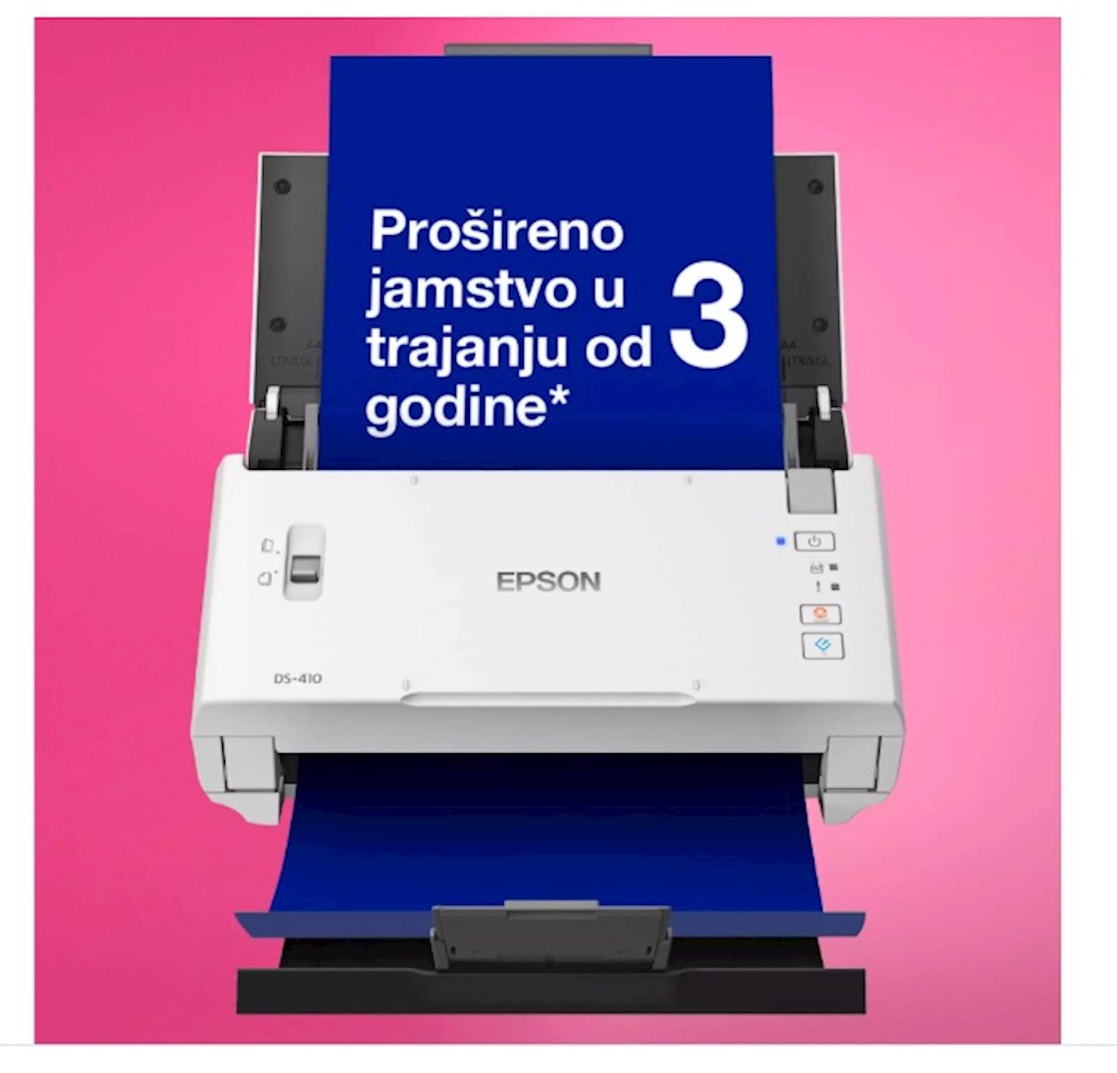 Skener WorkForce DS-410 pruža iznimnu produktivnost po cijeni uređaja iz nižeg ranga. To ga čini idealnim za male i kućne urede te korisnike koji traže poslovni skener bogato opremljen funkcijama, kao i IT odjele koji žele uložiti u robusne, svestrane stolne skenere za svoje tvrtke. DS-410 donosi niz neprocjenjivih značajki za produktivnost, uključujući otkrivanje dvostrukog umetanja i tehnologiju zaštite papira, koje vam jamče zaštitu izvornih dokumenata i skeniranje svake stranice. Skup naprednih LED senzora otkriva istovremeno uvlačenje dvaju komada papira, trenutačno zaustavlja stroj i upozorava korisnika. Za to vrijeme funkcija zaštite papira pomaže u sprečavanju nepravilnog umetanja i oštećenja automatskim zaustavljanjem u slučaju kada uređaj otkrije zaklamane ili neravno postavljene dokumente. Tu je i automatsko uvlačenje za brzo i jednostavno skeniranje. Samo umetnite listove i skener započinje s radom. Prihvat za automatsko uvlačenje kapaciteta 50 listova omogućuje jednostavno skeniranje velike količine dokumenata. DS-410 robusne je konstrukcije, pa se može nositi sa svim uredskim zadacima. Zahvaljujući vrlo kompaktnom kućištu, koje zauzima minimalan prostor na stolu, lako će se uklopiti i u najmanje urede. Brzina skeniranja je do 26 ppm/52 ipm, a maksimalna težina papira od 50 g/m2 do 209 g/m2. Također, ručni A3 način omogućuje ad-hoc skeniranje izvornih dokumenata većeg formata. Skener se isporučuje sa softverom Document Capture Pro 2.0 tvrtke Epson, jednostavnim i moćnim softverskim rješenjem za skeniranje, separaciju i prosljeđivanje dokumenata po cijeloj tvrtki.