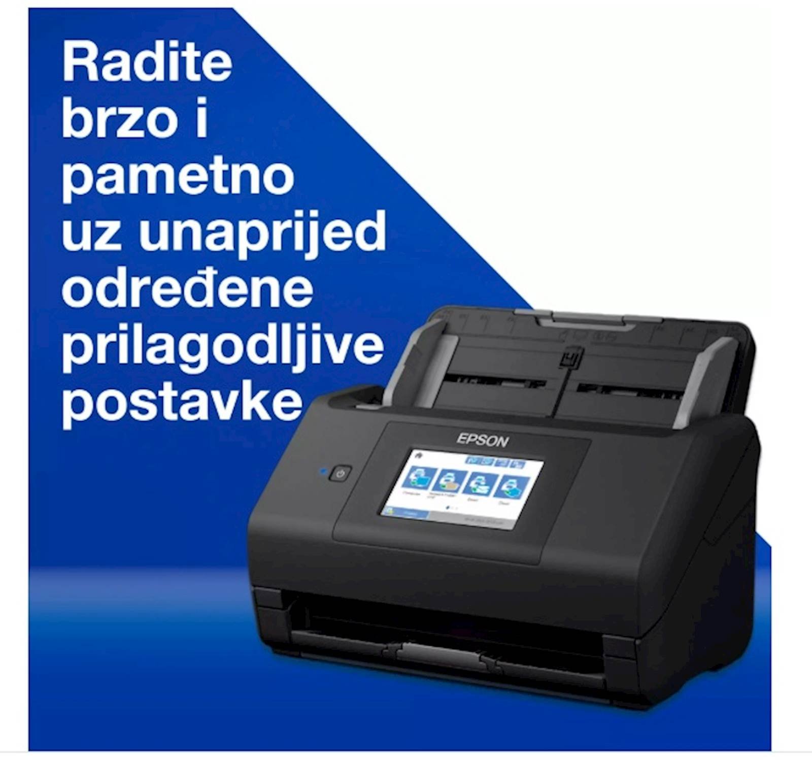 Neka vaše preduzece bude i dalje organizirano uz ovaj brzi skener s automatskim obostranim skeniranjem i automatskim ulaganjem papira formata A4. Pomocu velikog zaslona od 10,9 cm i Wi-Fi tehnologije možete spremiti dokumente izravno na njihovo mjesto. Radite brzo i pametno uz prilagodene postavke.