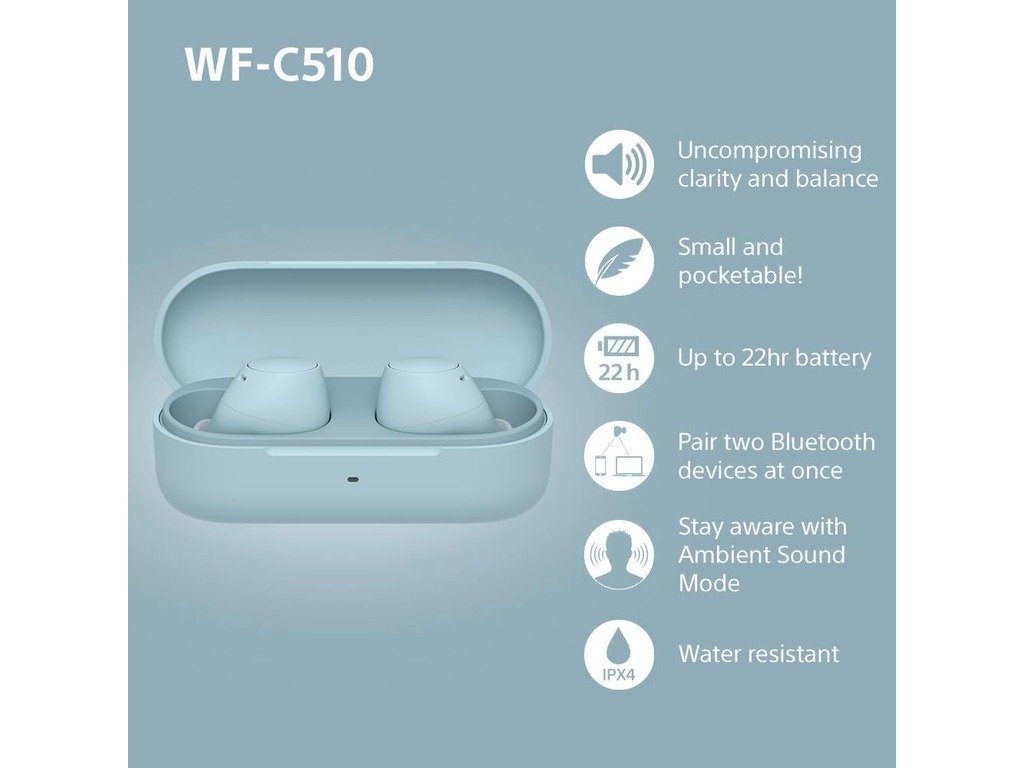 Sony bežične slušalice WF-C510; kompaktne i lagane za cjelodnevnu udobnost; 11 sati trajanja baterije, s još 11 sati u kutijici za punjenje; mikrofon; quick Access; istovremeno uparivanje s dva Bluetooth uređaja; pračenje zvuka okoline; boja plava