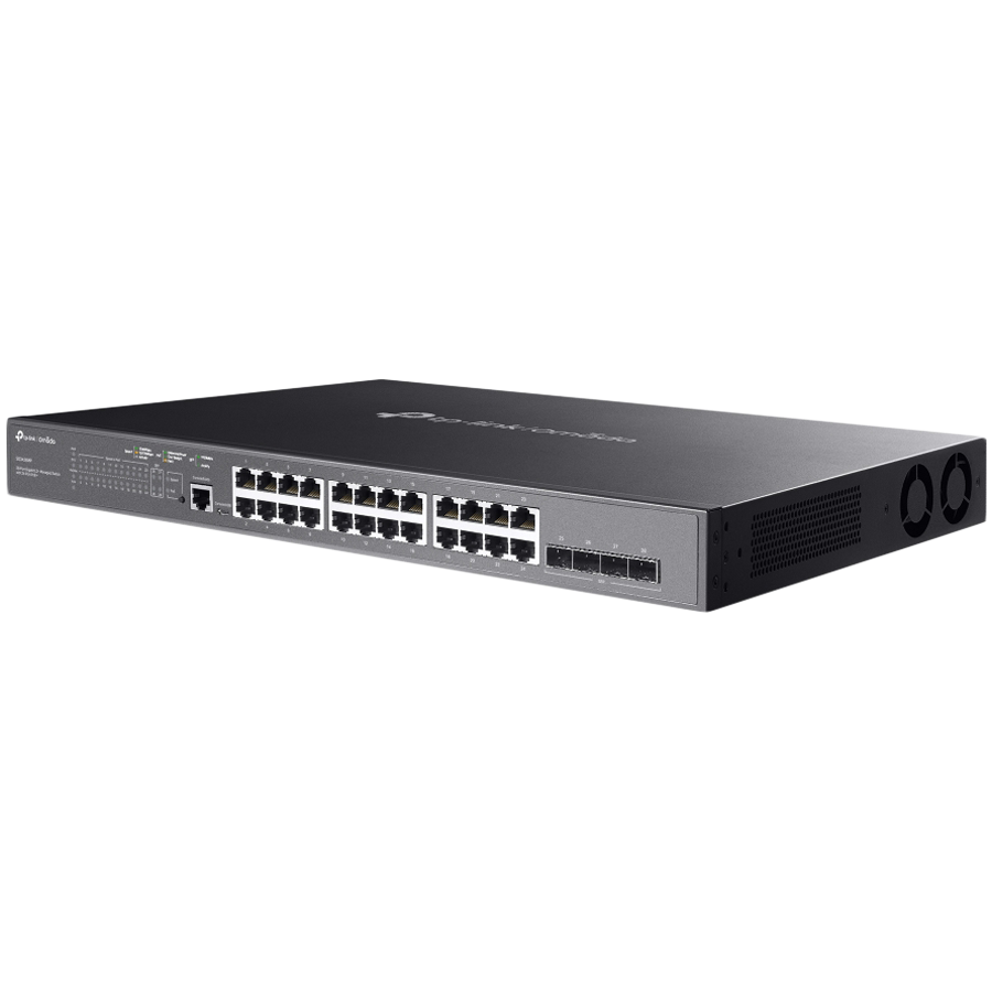 TP-Link SG3428MP Omada 28-Port Gigabit L2+ Managed Switch with 24× Gigabit 802.3af/at PoE+ ports and 4× Gigabit SFP slots, 384 W total PoE budget, Omada app, Static Routing, VLAN, ACL, QoS, IGMP Snooping, OAM, and DDM, ERPS, Zero-Touch Provisioning