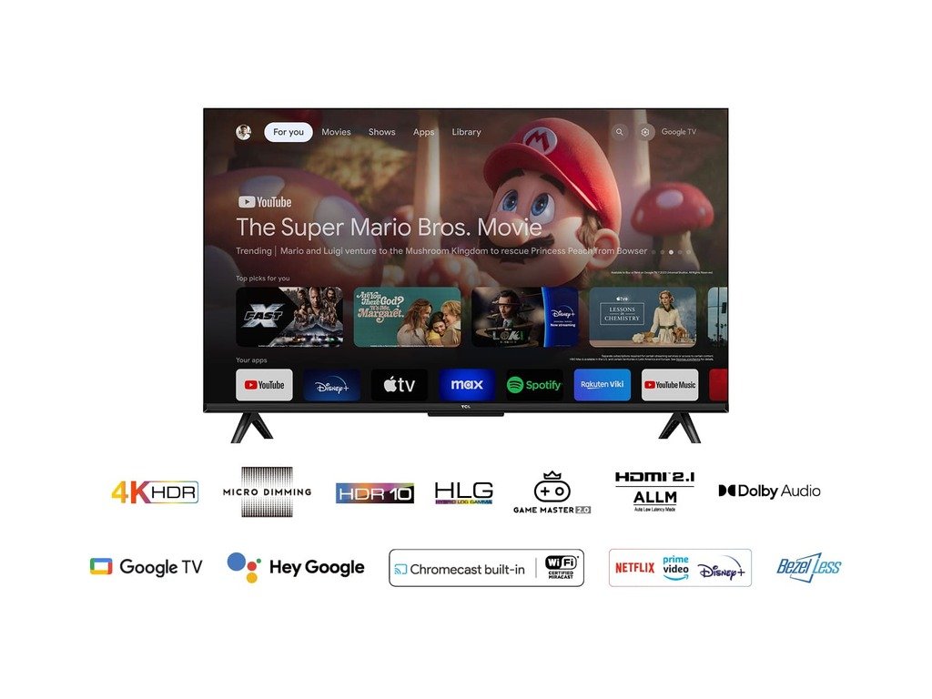 TCL 43″V6B 4K HDR;Micro Dimming; Dynamic Colour Enhancement; HDR10 and HDR HLG; Game Master 2.0; HDMI 2.1; Dolby Audio; Google TV; Google Assistant; Miracast & Google Cast (Chromecast); Netflix, Amazon Prime, Disney+; Bezel less