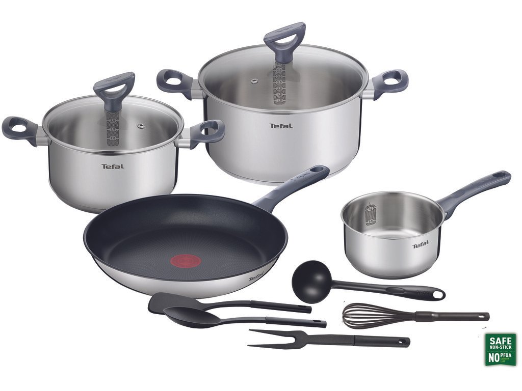 Tefal Daily Cook G713SB45 indukcijski set posuđa.Dvije velike serpe, promjera 20 cm i 24 cm, manja šerpica promjera 16 cm, tava promjera 26 cm,kutlača,velika kašika,lopatica,mutilica i viljuška za prevrtanje mesa.