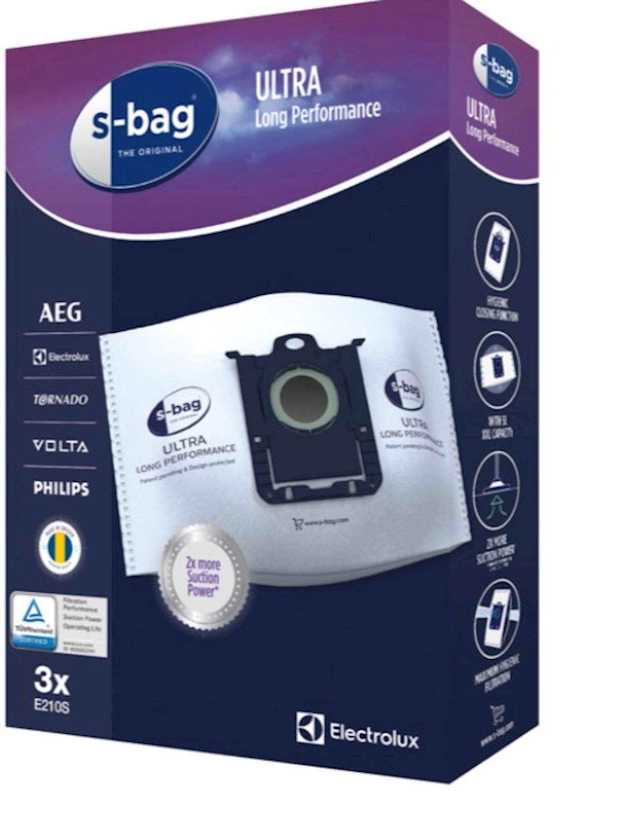 E210S S-bag ULTRA LONG PERFORMANCE vrecica za usisavac veceg kapaciteta s-bag® Ultra Long Performance traje 80 % dulje od tradicionalnih papirnatih vrecica za usisavac i ima optimalnu zapremninu od 5 litara. Ova vrecica pruža postojane vrhunske rezultate cišcenja tijekom mnogo duljeg vremena.